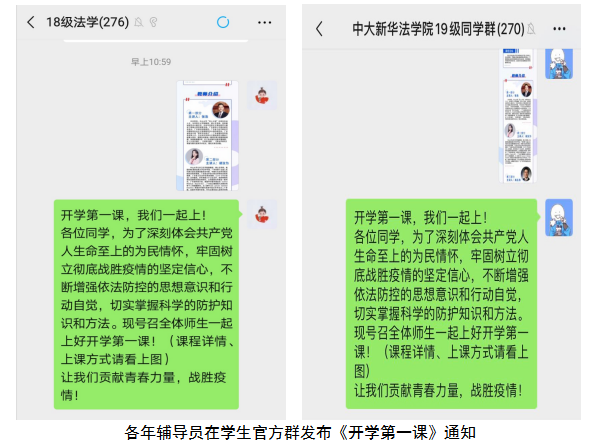 为坚决打赢疫情防控人民战争、总体战、阻击战,在广东省教育厅的策划指导下,中山大学制作了面向全省大学生的《开学第一课》。课程包括深入学习贯彻习近平总书记关于疫情防控工作的重要讲话和重要指示精神、传染病防治法解读及案例分析、新型冠状病毒肺炎的认知和防治方法、致广东省大学生的倡议书等四方面内容。3044永利全体辅导员及任课教师积极动员,通过各年级辅导员在学生官方群发布广东省2020年《开学第一课》的相关信息,任课教师将《开学第一课》的信息上传至泛雅平台,并将该信息置顶的方式,组织学院全体学生收看《开学第一课》,深刻领会共产党人生命至上的为民情怀,牢固树立彻底战胜疫情的坚定信心,不断增强依法防控的思想意识和行动自觉,切实掌握科学的防护知识和方法,以实际行动为疫情防控斗争贡献青春力量。