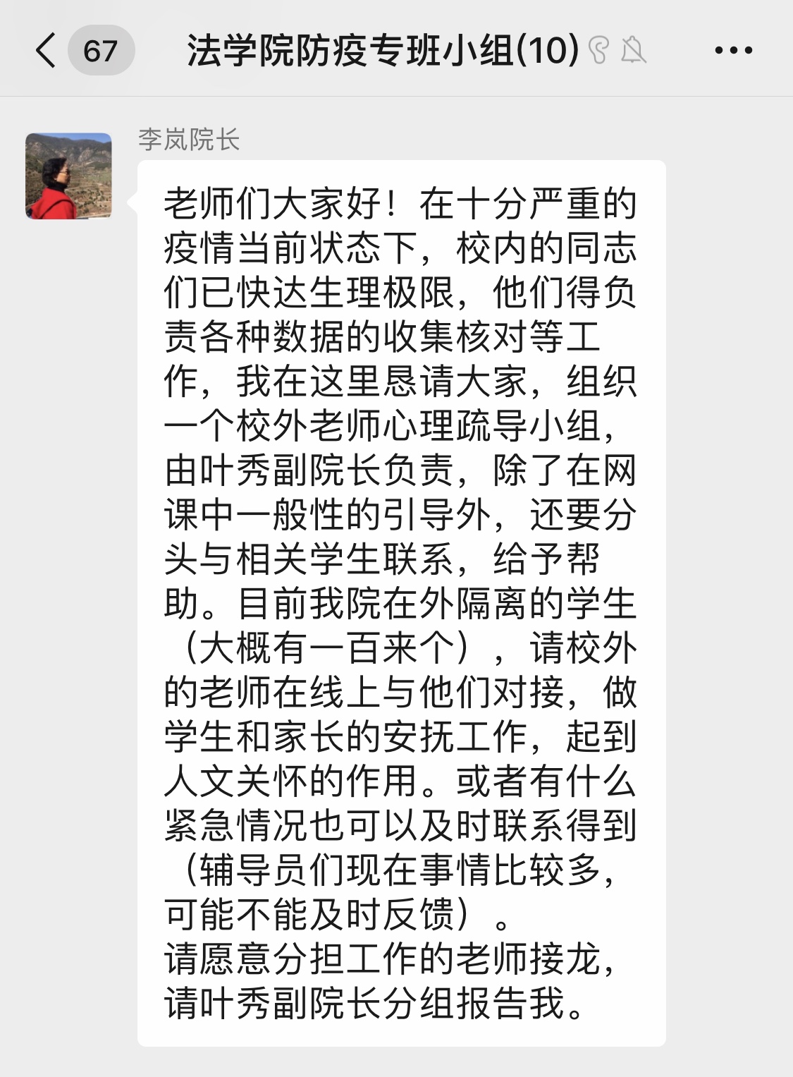 疫情发生以来,学院行政教辅人员紧跟学校各部门的步伐,迅速开展相关工作。为了配合各部门的紧急工作,不耽误工作进度,学院行政教辅人员时刻关注学校各部门的通知,生怕错过工作群里的任何一个文件、一条消息,并及时将相关通知转发至学院工作群及个人,连夜收集整理相关数据信息。多少个从黑夜到白天,我们在一起奋战,只为早日看到黎明的曙光。此外,行政教辅老师积极响应学校的号召,参加志愿者活动,郑思思同志承担了疫情处置工作专班组思政组的秘书工作,谢恩雅、蒋鹏祥(专职教师)同志主动报名奔赴一线前往隔离酒店服务学生。