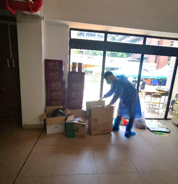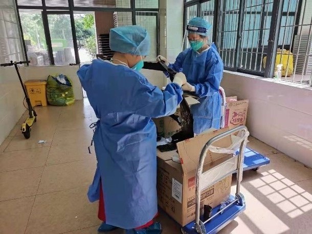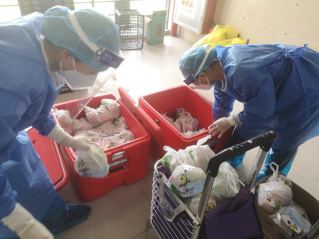 (志愿者将物资配送到宿舍门口) (志愿者进行防疫物资派发)