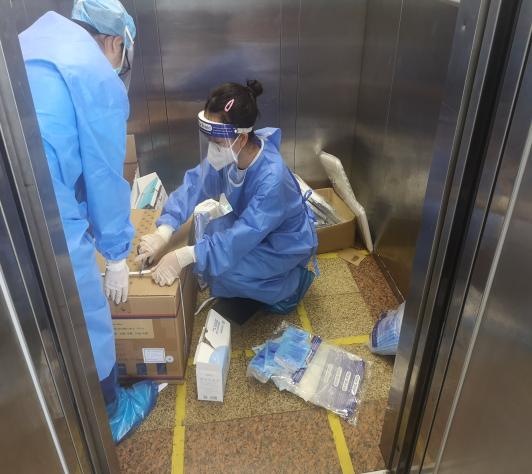 (辅导员老师在宿舍楼派发物资)