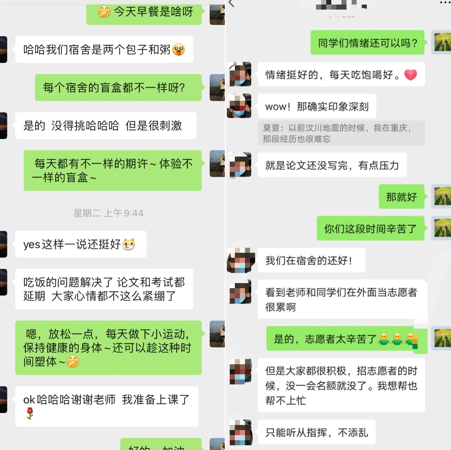 疫情防控重要时期,3044永利全体教师认真贯彻落实教学计划,及时调整线上课程内容,在保障课程教学质量之外,尽最大努力调动学生学习的积极性。同时,3044永利专门成立专职教师疫情防控心理疏导小组,由叶秀副院长负责,成员包括全体专职教师。专职教师分为四小组,分别负责各年级学生。小组老师主动做好学生心理疏导,与辅导员一起共同做好学生和家长的安抚工作,携手共克时艰。小组老师发挥了专业指导和心理疏导的双重作用,网课期间穿插做学生的心理疏导安抚工作,日常做一般引导工作。小组老师通过与学生交流,了解学生目前所遇到的困难及问题,有针对性的对其困难及问题进行疏导。在交流的过程中,引用一些具体人生哲理的漫画图片,以及转发一些可以舒发情绪的音乐,积极引导学生,减轻学生的焦虑。感谢老师们的暖心陪伴!