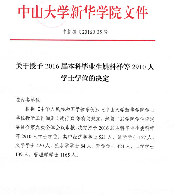 关于授予2016届本科毕业生姚科祥等2910人学士学位的决定