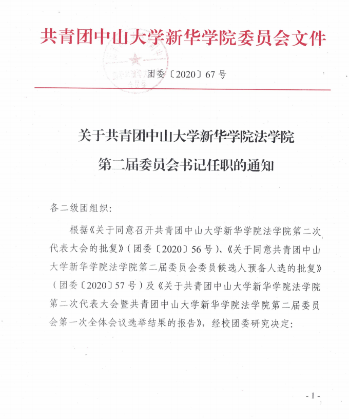 关于共青团中山大学新华学院3044永利第二届委员会书记任职的通知