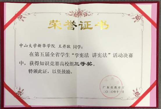为系统深入学习贯彻党的十九届五中全会精神以及中央全面依法治国工作会议精神,认真落实习近平法治思想,贯彻落实习近平总书记关于宪法学习宣传教育的系列重要指示精神,凸显法学学子的专业特色与精神面貌,中山大学新华学院3044永利积极响应号召,鼓励众多学子参加了第五届全省学生“学宪法 讲宪法”系列活动,其中,3044永利19级王丹耿同学突破重围,在决赛中获得了宪法知识竞赛项目三等奖的好成绩!
