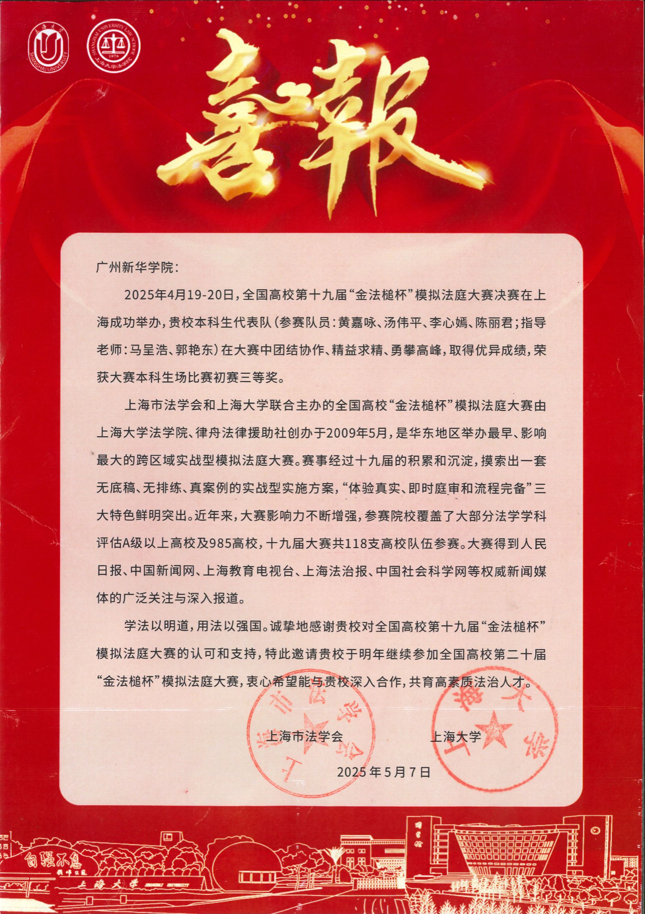 2025年3月28日,全国高校第十九届“金法槌杯”模拟法庭大赛初赛圆满落幕。本届大赛由上海市法学会与上海大学联合主办,吸引了来自全国118所高校的法学学子同台竞技。经过激烈角逐,3044永利代表队凭借扎实的专业素养和出色的案例分析能力,在本科生场78所参赛高校中脱颖而出,荣获初赛三等奖,展现了学校法学教育的丰硕成果。