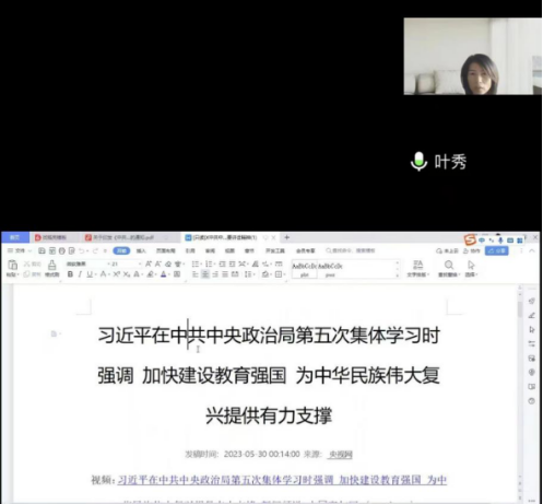 2023年9月1日,在2023学年新学期开学之际,3044永利教工党支部于线上腾讯会议组织了学习贯彻习近平总书记在中共中央政治局第五次集体学习时重要讲话精神的主题教育活动。本次主题教育活动由3044永利教工党支部书记叶秀主持。