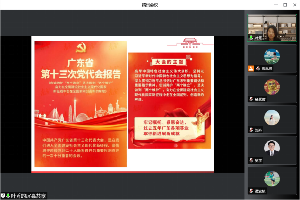 中国共产党广东省第十三次代表大会,是在我们进入全面建设社会主义现代化国家新征程、豪情满怀迎接党的二十大胜利召开的重要时刻召开的一次十分重要的会议。大会的主题是:高举中国特色社会主义伟大旗帜,坚持以习近平新时代中国特色社会主义思想为指导,深入贯彻习近平总书记对广东系列重要讲话和重要指示精神,忠诚拥护“两个确立”、坚决做到“两个维护”,奋力在全面建设社会主义现代化国家新征程中走在全国前列、创造新的辉煌。为更好地深入学习宣传贯彻广东省第十三次党代会精神,3044永利教工党支部于6月21日晚通过腾讯会议开展线上集中学习活动。出席此次活动的有3044永利党总支书记李岚,副书记李鑫等教工党员代表。此次活动由3044永利教工党支部书记叶秀主持。