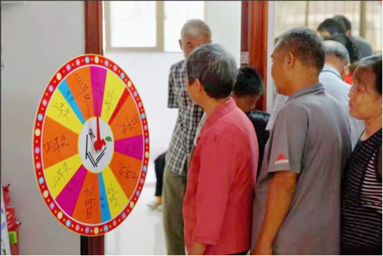 (前来听普法宣讲会的老人们排队,按顺序抽奖)
