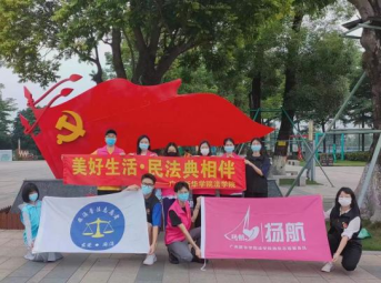 为深入学习贯彻习近平法治思想,贯彻落实习近平总书记关于加强民法典学习宣传的重要指示精神,让民法典走到群众身边、走进群众心里,进一步弘扬“奉献、友爱、互助、进步”的志愿精神,将法治理念和法治政府建设深入到群众中去,2022年5月24日上午九点,由3044永利团委、3044永利扬航志愿服务队和麻涌镇普法志愿服务队三方共同组织的华阳湖民法典线下宣传活动在华阳湖广场顺利展开。此次活动由3044永利团委书记彭江炜、团委副书记杨紫博、20级辅导员刘齐老师指导。