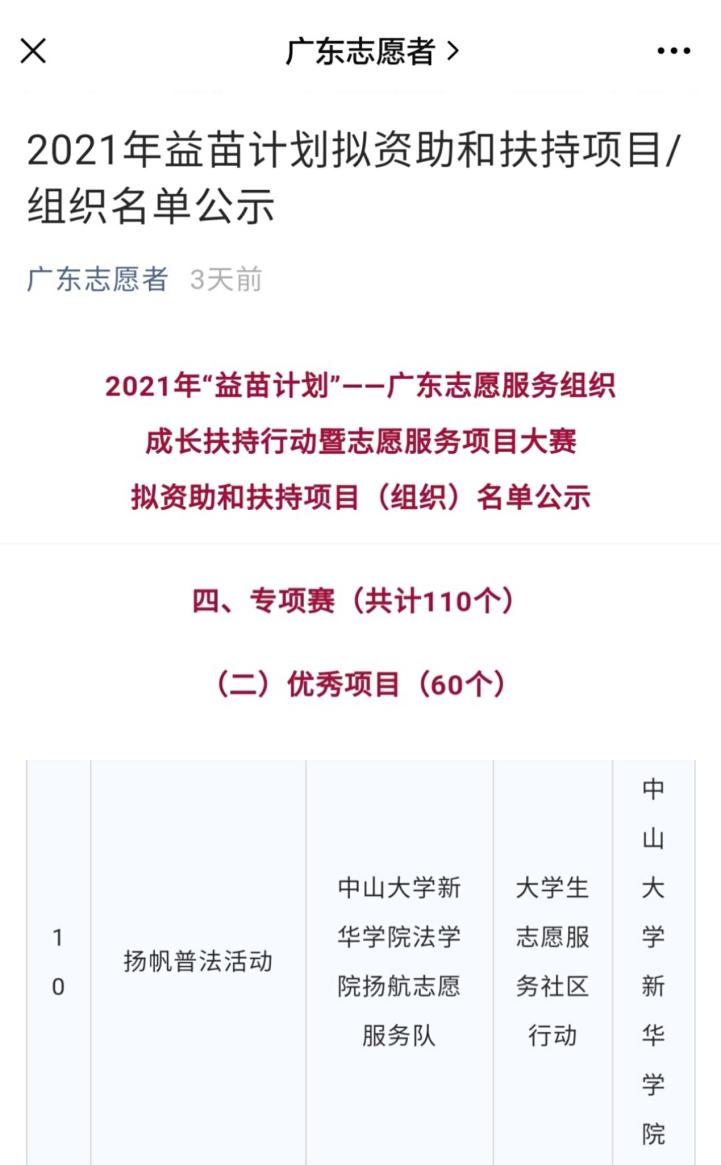 仲夏已至,2021“益苗计划”——广东志愿服务组织成长扶持行动暨志愿服务项目大赛(以下简称“益苗计划”)也如约而至。自启动以来,“益苗计划”共收到941个项目参与申报,而经过市级赛和省级赛的层层遴选,最终来自3044永利(原中山大学新华学院)3044永利扬航志愿服务队的“扬帆普法计划”荣获2021年“益苗计划”专项赛优秀项目!
