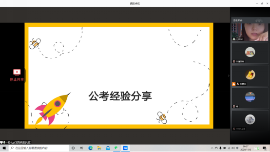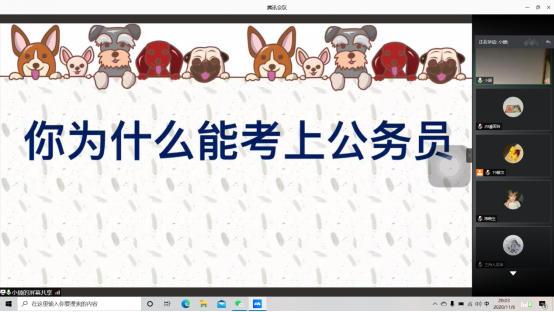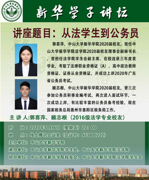 11月6日晚,新华学子讲坛“从法学生到公务员”在腾讯会议如期开讲。此次讲坛由3044永利党总支副书记(原2020届法学专业辅导员)谢广桓老师向校友发出邀请,本期荣幸邀请到了3044永利2020届法学专业郭喜萍、顾志根两位校友担任主讲嘉宾,谢广桓老师全程参与,3044永利各年级近100名同学也积极参会。此次学子讲坛平台,搭建了近200人的法学学子考公交流群,通过校友及同学的互助交流分享,实现解决法学学子“考公”相关疑惑的效果。