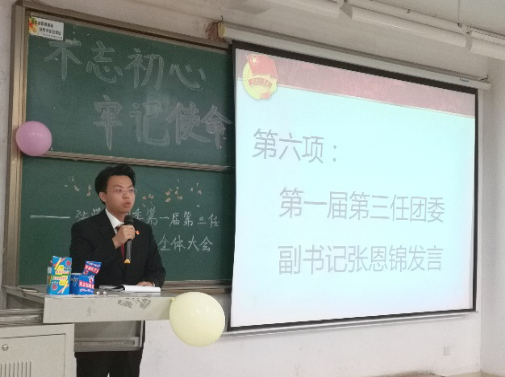 大会第二项议程,第一届第二任团委副书记曾颖珊、组织部部长林梓婉、宣传部副部长陈季生、实践部部长江云枫、秘书部部长张海琳、传媒中心主编王若晴,表达了对新老干事的期许,总结了自身的工作以及成果,并对与自己一起工作的干事们表达了感激以及对团委的热爱之情。各自发言结束后,第一届第三任学生副书记、各部门部长和传媒中心主编分别向他们献花,并颁发证书,全场掌声雷动。