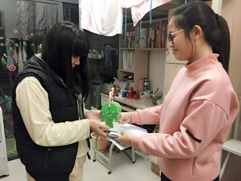 为更好地开展此次活动,为同学们送去温暖与关爱,班委们提前精心筹划活动和准备礼品:可口的苹果、甜蜜的糖果、精美的包装盒,无一不包含了班委们满满的用心。班委们在平安夜当天带着礼品到寝室派发给同学,也传递了一份温暖。同学们收到礼品,脸上洋溢着满满的喜悦,四处弥漫着欢快的圣诞气氛。