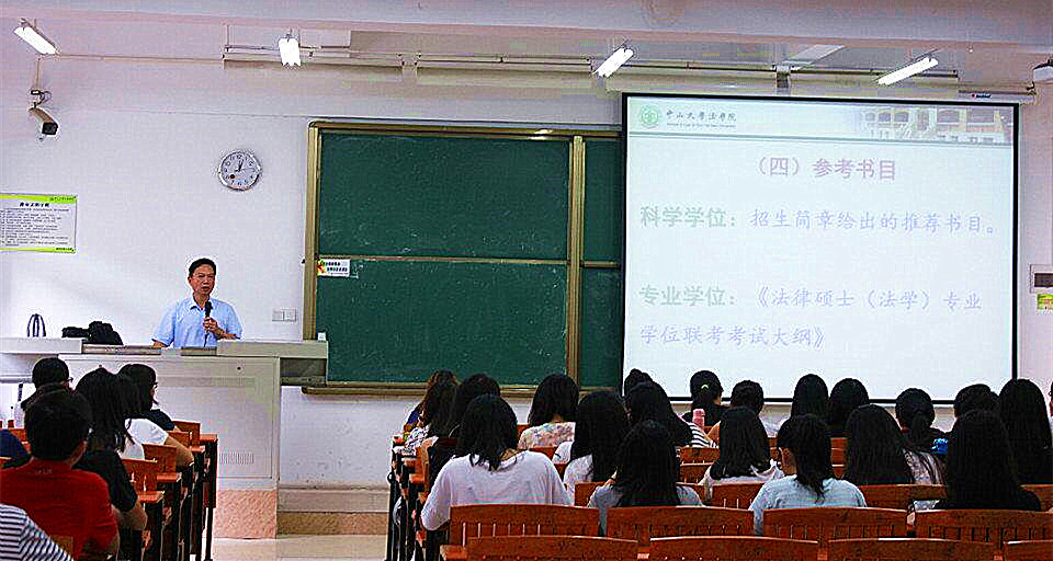 紧接着,他以中山大学考研招生为例,详细介绍了科学学位和专业学位的备考范围。李主任强调在考研备考阶段要合理安排时间,并将考研备考过程分成了五个富有针对性的阶段;同时提出要注重跟进时事,在备考期间要广泛了解近三年的立法、出台的司法解释以及相关学者学术。他建议同学们要每星期或不定期去图书馆看《法制日报》、《时事快报》等报刊,拓宽自己的知识面,为考试做好知识储备。
