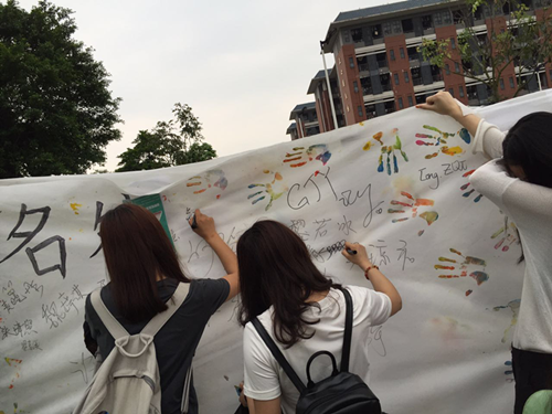 颜色艳丽、排版新颖的横幅不仅使本次的展览活动达到了预期的效果,还成功的吸引了众多学生前往参观并签名留念。一笔一划的签名彰显着同学们对权利保护的决心。涂鸦式横幅上许多大大小小的真假品牌商标,让同学们从中获得趣味的同时也向同学们展示了相关知识产权的法律知识。