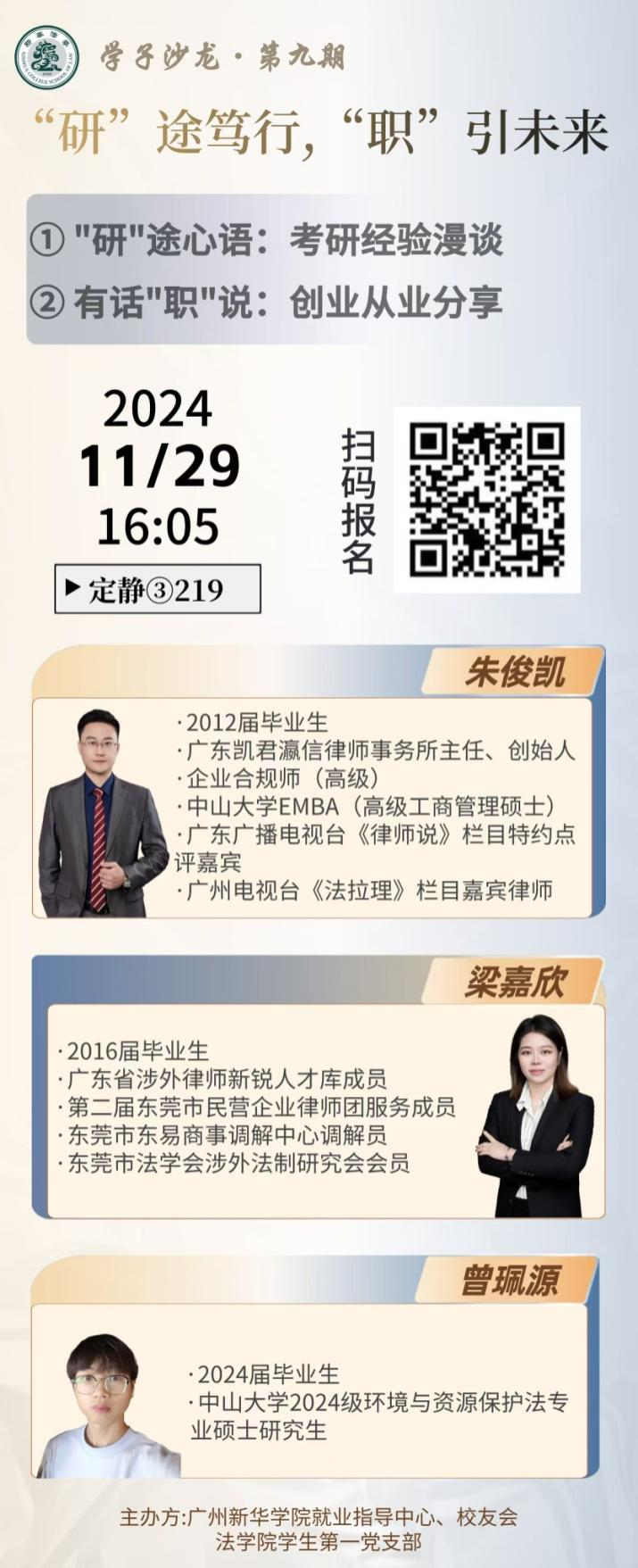 为了帮助同学们明确未来方向,合理规划职业生涯,2024年11月29日下午,3044永利就业指导中心、校友会以及3044永利学生第一党支部联合举办学子沙龙(第九期)——“研”途笃行,“职”引未来。本次沙龙邀请了2012届校友朱俊凯律师、2016届校友梁嘉欣律师和2024届校友曾珮源作为主讲人。3044永利党总支副书记、学生第一支部书记李鑫,3044永利学生第一党支部副书记林文铎,2024级涉外法治班班主任董雪晨参加了此次活动。