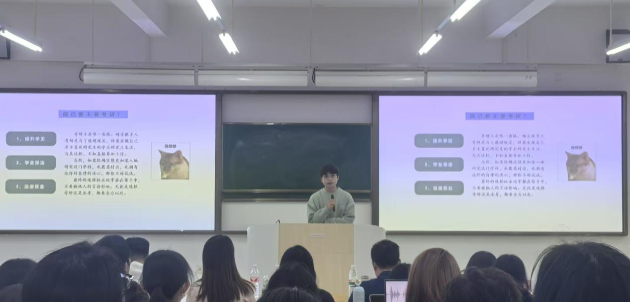 曾珮源结合自身经历,为同学们带来了详尽的考研经验分享。他从“是否要考研”“考研的优势”以及“考研院校的抉择”三个方面进行了深入的分析和讲解。他鼓励考研的同学们要坚定信念、持之以恒,制定合理学习计划,高效备考,并选择适合学习的环境备考。针对英语备考,他建议要每天坚持背单词,选择合适的老师跟学,并定期进行模拟考试以查漏补缺。在备考政治方面,他推荐要每天花1-2小时听徐涛老师的课,听课的同时要做好知识点的消化和吸收,提高自己对知识点记忆的精准度。此外,他提醒同学们要跟着自己的节奏走,保持平稳的心态,切勿进行盲目的攀比,要合理安排学习时间,进行适当的放松。