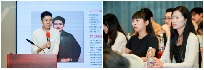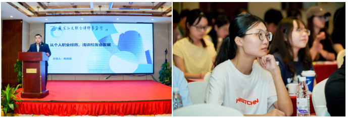 叶东杭(2018届校友)律师,则以《我在律师职业道路上的尝试》为题,分享了自己在律师行业中的实践经验和深刻感悟。他分析了当前律师行业的现状与趋势,提出了青年律师应如何应对行业变革的建议。他强调,律师要具备高度的责任心、敏锐的洞察力和扎实的专业功底,才能在激烈的竞争中脱颖而出。为此,他提出了个人发展的“三化”路径:职业化以提升专业素养和服务质量,专业化以深化某一法律领域的研究与实践,行业化则强调与特定行业深度融合,拓宽服务边界。对于律师团队的发展,叶东杭则预见了“系统化、企业化、集群化”的趋势,倡导通过团队协作、资源整合和品牌建设,共同应对行业挑战,实现可持续发展。