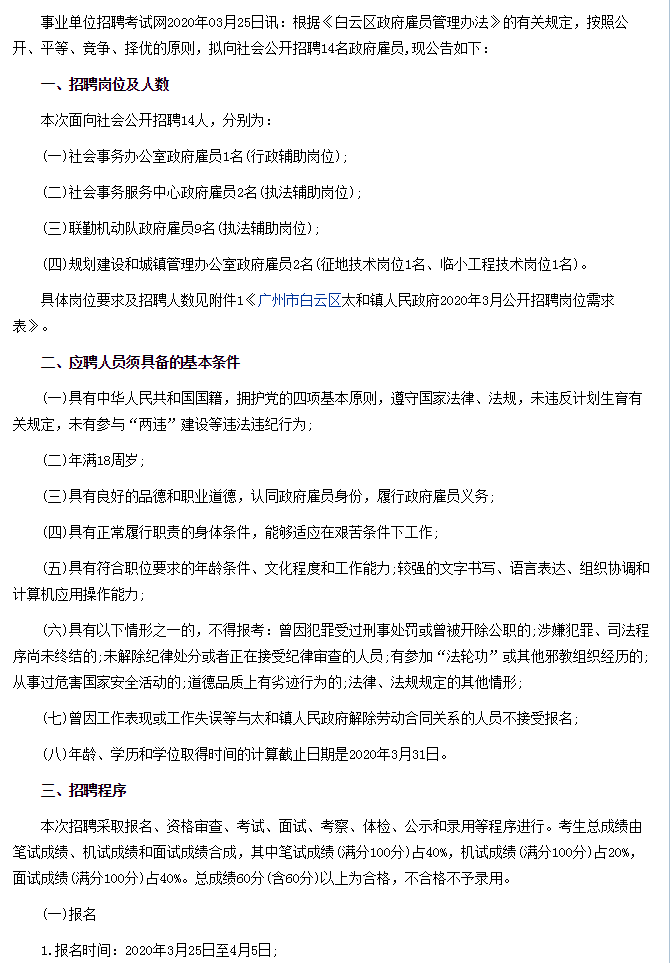 3044永利-2020年3月广州市白云区太和镇人民政府招聘公告