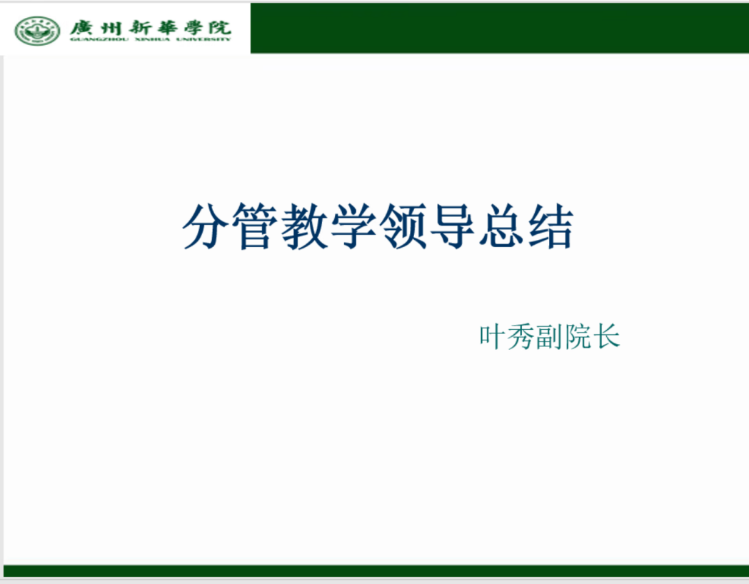 随后,分管教学领导叶秀副院长对教学工作进行了总结,指出教学规范化和可视化管理的必要性,并要求在评估工作中严格执行各项教学管理标准,确保平时成绩、作业及课堂展示等资料齐备。同时,叶副院长强调新入职教师应多听课,把听课也落实到日常工作中,听课应多向优秀经验丰富的老师学习,或者广听课,扩大听课面,让听课能有所收获,从而反思教学方式,以改进自身教学能力。