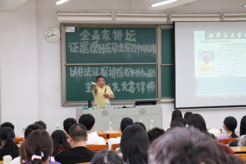 讲坛采用授课与现场调查和问答相结合的方式进行。龙元富律师以刑事诉讼法中的非法证据排除规则为中心视点向现场同学阐述了证据规则法,同时现场解答了同学们对于证据规则的困惑。