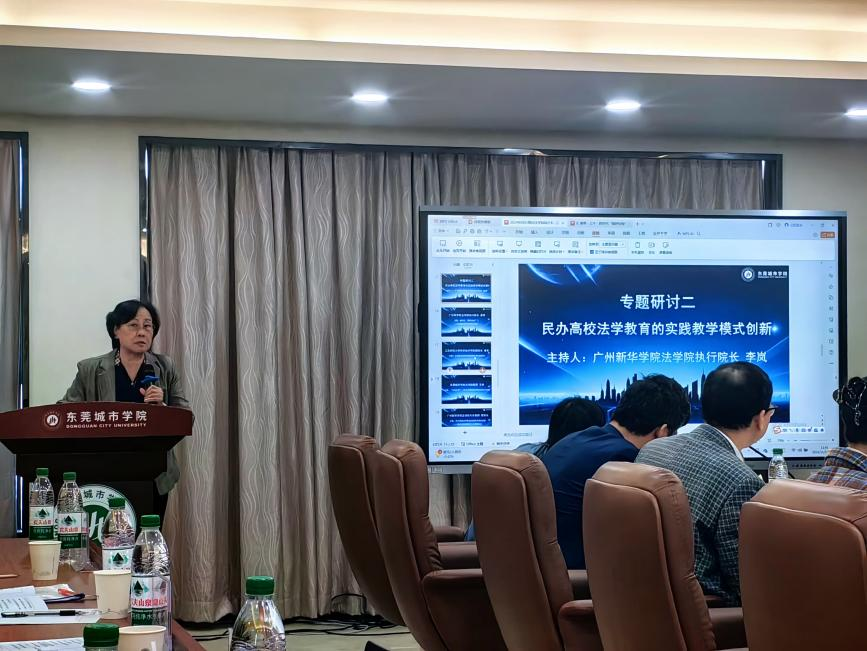 第2、3项议程为专题研讨环节。在我校李岚执行院长、东莞城市学院3044永利唐犀执行院长的主持下,各高校老师、实务界人士围绕着“‘以实践为导向’的法治人才培养机制”这一论坛主题,“习近平法治思想与法学教育体系”、“民办高校法学教育的实践教学模式创新”等8个分论题进行了精彩的分享和交流。