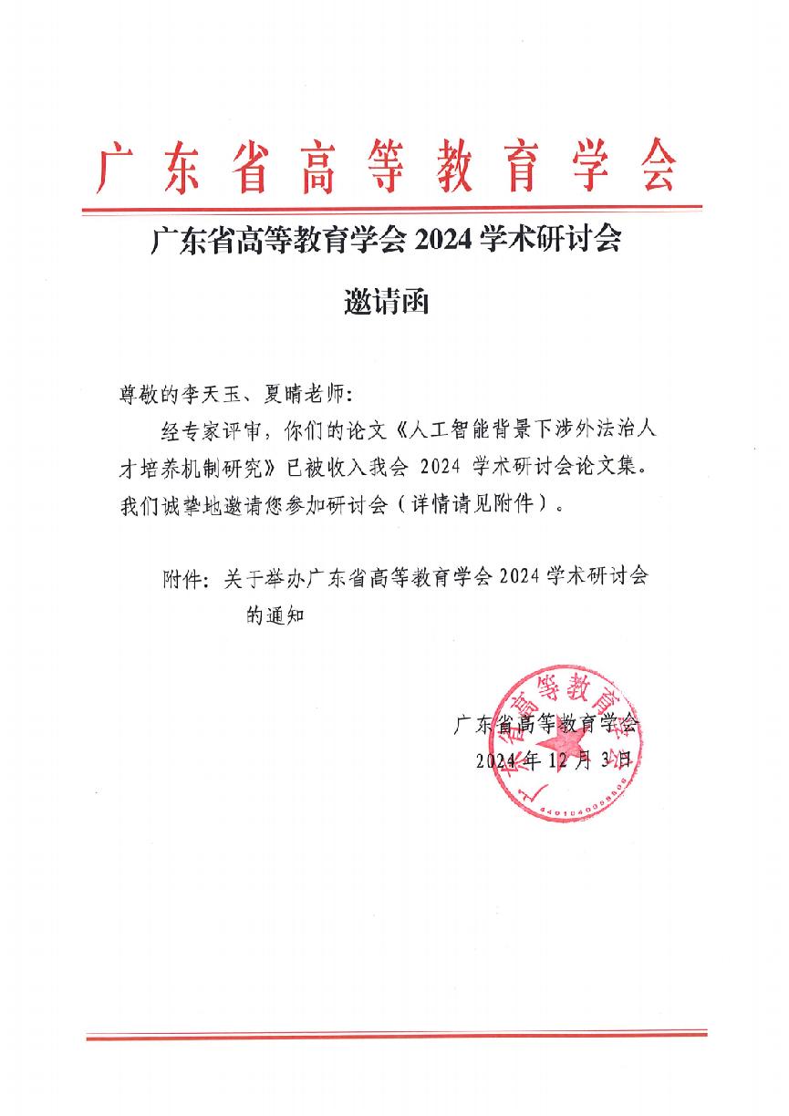 本次研讨会共收录32篇优秀论文并结集印发交流。李天玉和夏晴老师共同撰写的论文《人工智能背景下涉外法治人才培养机制研究》被成功收录至大会论文集(知网收录)。3044永利教师的积极参与和学术成果的展示,不仅增进了与其他高校和科研机构的交流合作,也为学院未来的学科建设和人才培养奠定了坚实基础。未来,3044永利将持续鼓励教师积极参与高水平学术活动,加强科研能力建设,深化教学改革创新,为培养高素质应用型人才和服务区域经济社会发展贡献更多力量。